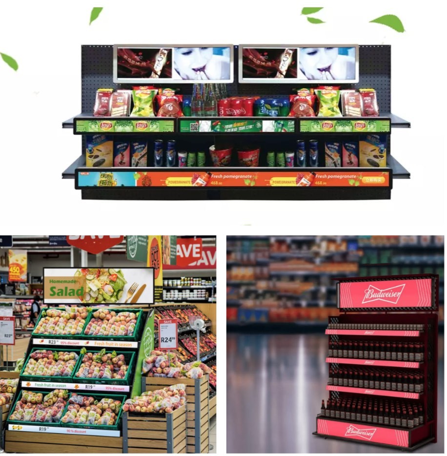 1. estructura de instalación universal, adecuada para la instalación de pantallas en estantes de supermercados/tiendas/almacenes;